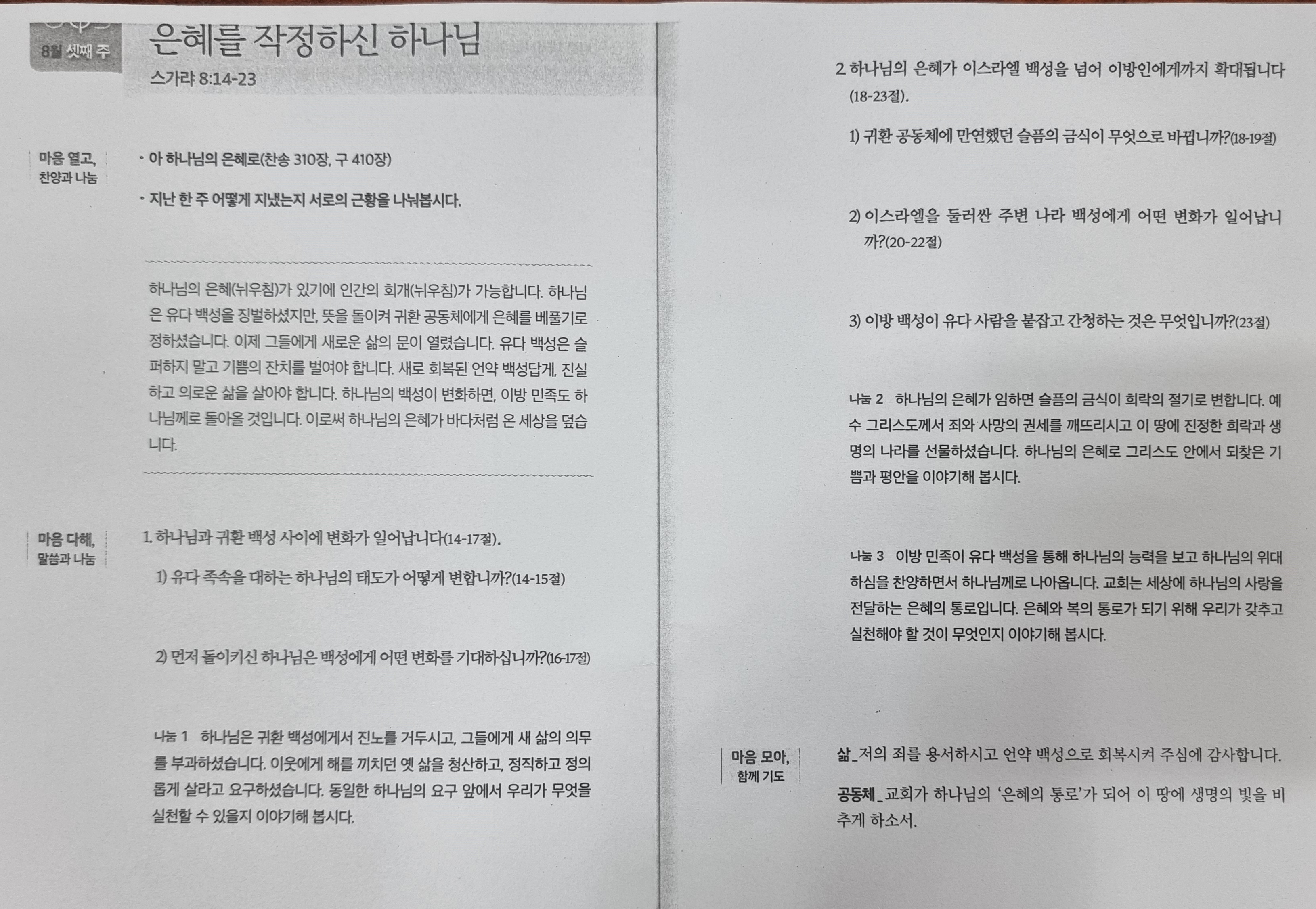 본 영상의 사이즈와 화질은 500kbps, 중간화질입니다. 영상은 업로드 시 설정할 수 있습니다. [성경본문] 스가랴8:14-23절 개역개정14. 만군의 여호와가 이같이 말하노라 너희 조상들이 나를 격노하게 하였을 때에 내가 그들에게 재앙을 내리기로 뜻하고 뉘우치지 아니하였으나 15. 이제 내가 다시 예루살렘과 유다 족속에게 은혜를 베풀기로 뜻하였나니 너희는 두려워하지 말지니라 16. 너희가 행할 일은 이러하니라 너희는 이웃과 더불어 진리를 말하며 너희 성문에서 진실하고 화평한 재판을 베풀고 17. 마음에 서로 해하기를 도모하지 말며 거짓 맹세를 좋아하지 말라 이 모든 일은 내가 미워하는 것이니라 여호와의 말이니라 18. 만군의 여호와의 말씀이 내게 임하여 이르시되 19. 만군의 여호와가 이같이 말하노라 넷째 달의 금식과 다섯째 달의 금식과 일곱째 달의 금식과 열째 달의 금식이 변하여 유다 족속에게 기쁨과 즐거움과 희락의 절기들이 되리니 오직 너희는 진리와 화평을 사랑할지니라 20. 만군의 여호와가 이와 같이 말하노라 다시 여러 백성과 많은 성읍의 주민이 올 것이라 21. 이 성읍 주민이 저 성읍에 가서 이르기를 우리가 속히 가서 만군의 여호와를 찾고 여호와께 은혜를 구하자 하면 나도 가겠노라 하겠으며 22. 많은 백성과 강대한 나라들이 예루살렘으로 와서 만군의 여호와를 찾고 여호와께 은혜를 구하리라 23. 만군의 여호와가 이와 같이 말하노라 그 날에는 말이 다른 이방 백성 열 명이 유다 사람 하나의 옷자락을 잡을 것이라 곧 잡고 말하기를 하나님이 너희와 함께 하심을 들었나니 우리가 너희와 함께 가려 하노라 하리라 하시니라 2025년 8월 셋째주 순장반공부 「은혜를 작정하신 하나님」