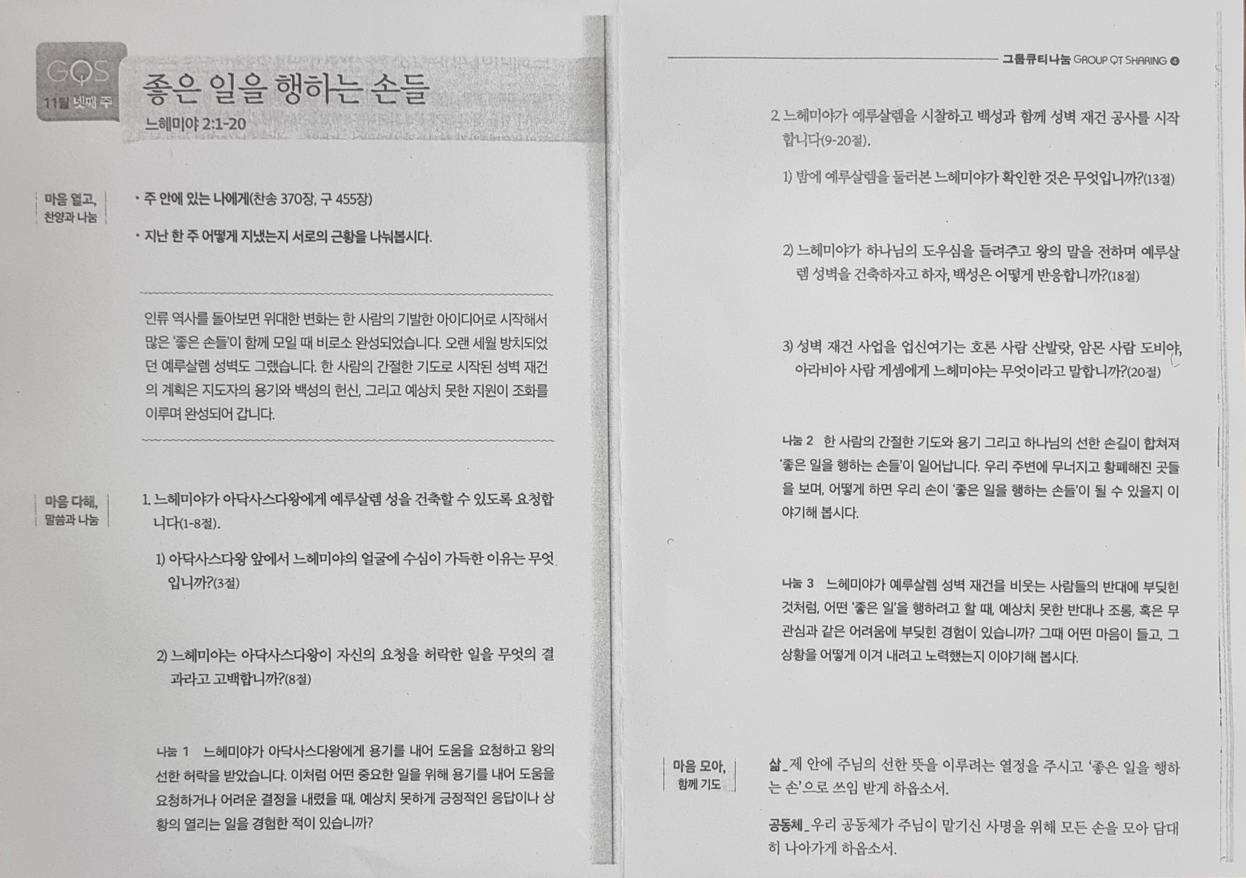 본 영상의 사이즈와 화질은 500kbps, 중간화질입니다. 영상은 업로드 시 설정할 수 있습니다. [성경본문] 느헤미야2:1-20절 개역개정1. 아닥사스다 왕 제이십년 니산월에 왕 앞에 포도주가 있기로 내가 그 포도주를 왕에게 드렸는데 이전에는 내가 왕 앞에서 수심이 2. 왕이 내게 이르시되 네가 병이 없거늘 어찌하여 얼굴에 수심이 있느냐 이는 필연 네 마음에 근심이 있음이로다 하더라 그 때에 내가 크게 두려워하여 3. 왕께 대답하되 왕은 만세수를 하옵소서 내 조상들의 묘실이 있는 성읍이 이제까지 황폐하고 성문이 불탔사오니 내가 어찌 얼굴에 수심이 없사오리이까 하니 4. 왕이 내게 이르시되 그러면 네가 무엇을 원하느냐 하시기로 내가 곧 하늘의 하나님께 묵도하고 5. 왕에게 아뢰되 왕이 만일 좋게 여기시고 종이 왕의 목전에서 은혜를 얻었사오면 나를 유다 땅 나의 조상들의 묘실이 있는 성읍에 보내어 그 성을 건축하게 하옵소서 하였는데 6. 그 때에 왕후도 왕 곁에 앉아 있었더라 왕이 내게 이르시되 네가 몇 날에 다녀올 길이며 어느 때에 돌아오겠느냐 하고 왕이 나를 보내기를 좋게 여기시기로 내가 기한을 정하고 7. 내가 또 왕에게 아뢰되 왕이 만일 좋게 여기시거든 강 서쪽 총독들에게 내리시는 조서를 내게 주사 그들에게 나를 용납하여 유다에 들어가기까지 통과하게 하시고 8. 또 왕의 삼림 감독 아삽에게 조서를 내리사 그가 성전에 속한 영문의 문과 성곽과 내가 들어갈 집을 위하여 들보로 쓸 재목을 내게 주게 하옵소서 하매 내 하나님의 선한 손이 나를 도우시므로 왕이 허락하고 9. 군대 장관과 마병을 보내어 나와 함께 하게 하시기로 내가 강 서쪽에 있는 총독들에게 이르러 왕의 조서를 전하였더니 10. 호론 사람 산발랏과 종이었던 암몬 사람 도비야가 이스라엘 자손을 흥왕하게 하려는 사람이 왔다 함을 듣고 심히 근심하더라 11. 내가 예루살렘에 이르러 머무른 지 사흘 만에 12. 내 하나님께서 예루살렘을 위해 무엇을 할 것인지 내 마음에 주신 것을 내가 아무에게도 말하지 아니하고 밤에 일어나 몇몇 사람과 함께 나갈새 내가 탄 짐승 외에는 다른 짐승이 없더라 13. 그 밤에 골짜기 문으로 나가서 용정으로 분문에 이르는 동안에 보니 예루살렘 성벽이 다 무너졌고 성문은 불탔더라 14. 앞으로 나아가 샘문과 왕의 못에 이르러서는 탄 짐승이 지나갈 곳이 없는지라 15. 그 밤에 시내를 따라 올라가서 성벽을 살펴본 후에 돌아서 골짜기 문으로 들어와 돌아왔으나 16. 방백들은 내가 어디 갔었으며 무엇을 하였는지 알지 못하였고 나도 그 일을 유다 사람들에게나 제사장들에게나 귀족들에게나 방백들에게나 그 외에 일하는 자들에게 알리지 아니하다가 17. 후에 그들에게 이르기를 우리가 당한 곤경은 너희도 보고 있는 바라 예루살렘이 황폐하고 성문이 불탔으니 자, 예루살렘 성을 건축하여 다시 수치를 당하지 말자 하고 18. 또 그들에게 하나님의 선한 손이 나를 도우신 일과 왕이 내게 이른 말씀을 전하였더니 그들의 말이 일어나 건축하자 하고 모두 힘을 내어 이 선한 일을 하려 하매 19. 호론 사람 산발랏과 종이었던 암몬 사람 도비야와 아라비아 사람 게셈이 이 말을 듣고 우리를 업신여기고 우리를 비웃어 이르되 너희가 하는 일이 무엇이냐 너희가 왕을 배반하고자 하느냐 하기로 20. 내가 그들에게 대답하여 이르되 하늘의 하나님이 우리를 형통하게 하시리니 그의 종들인 우리가 일어나 건축하려니와 오직 너희에게는 예루살렘에서 아무 기업도 없고 권리도 없고 기억되는 바도 없다 하였느니라 2025년 11월 넷째주 순장반공부 「좋은 일을 행하는 손들」